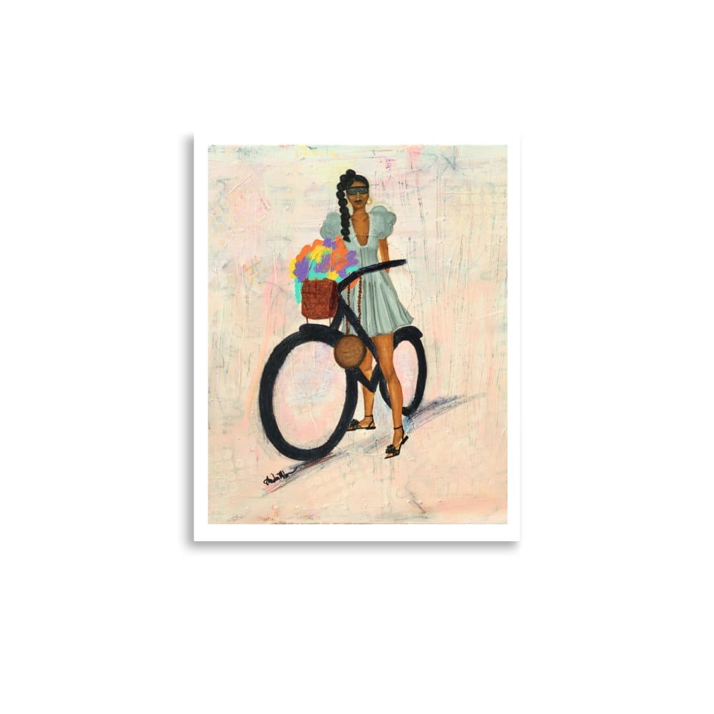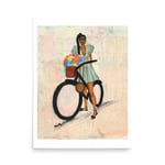 Add a fashionable accent to your room with this fun art print by Shadia Milan. The artwork features a fashionable lady with her bicycle, surrounded by vibrant colors. This print is ready to frame and hang. High quality print made on thick and durable matte paper.