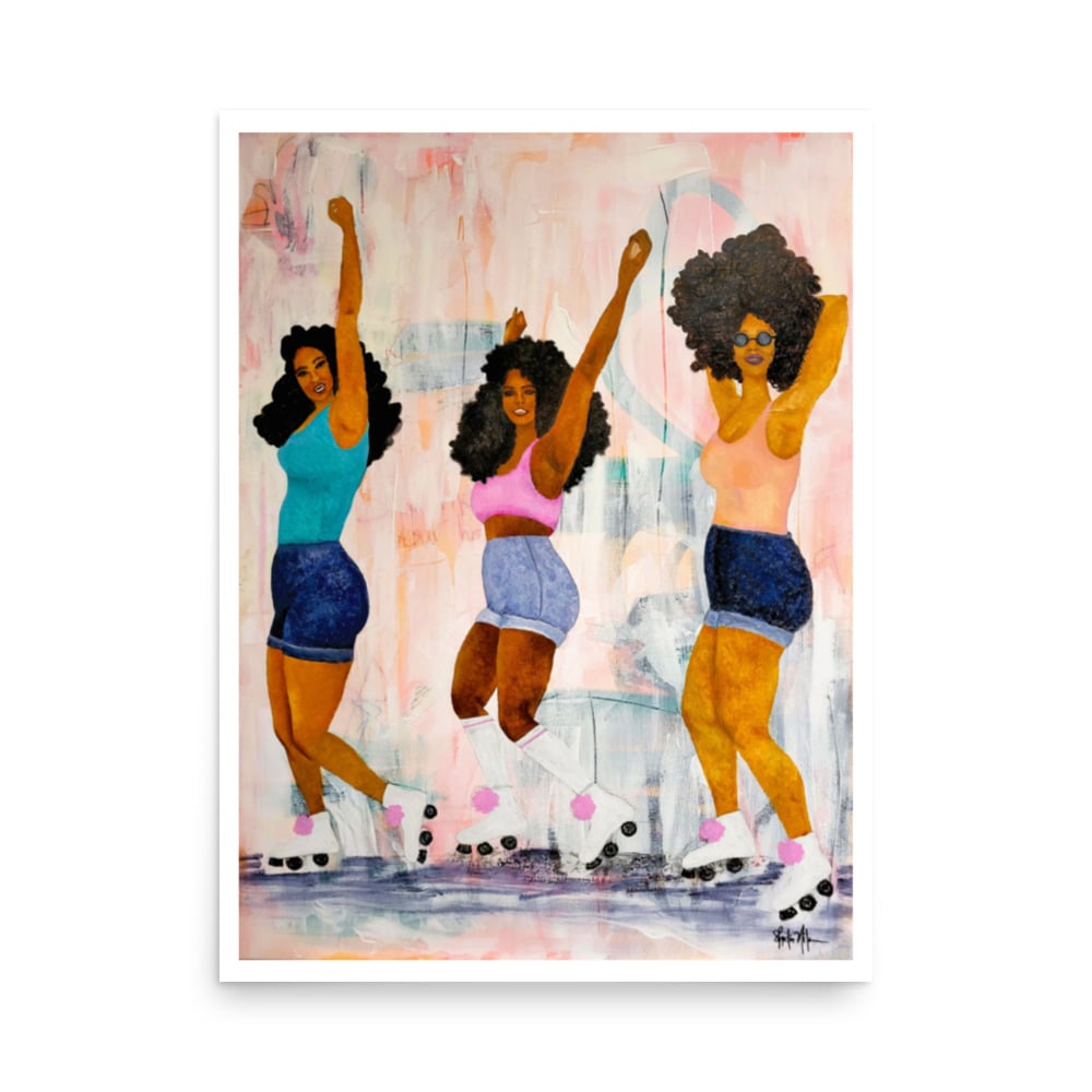 Add a fashionable accent to your room with this fun art print by Shadia Milan. The artwork features 3 ladies in vibrant colors, skating. This print is ready to frame and hang. High quality print made on thick and durable matte paper.